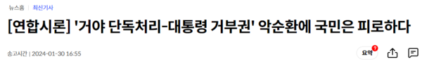 윤석열 대통령이 지난달 30일 이태원참사 특별법 거부권을 행사하자 연합뉴스는 ‘연합시론’을 통해 “거야 단독처리와 대통령 거부권 악순환으로 국민이 피로하다”며 애매한 ‘양비론’을 펼치기도 했다. 연합뉴스는 김건희 씨 주가조작 의혹과 대장동 50억클럽 특검법, 이태원참사 특별법 등에 대한 대통령 거부권 행사(회수로 5번, 건수로 9개)가 거대 야당의 ‘입법독주’ 때문으로 보고 있는 것이다. 시시비비를 가려내 옳지 못한 권력행사를 비판하기보다는 양비론으로 무책임한 언론의 전형을 보여주고 있다. 김건희 씨의 주가조작 의혹, 명품백 수수 의혹, 야당의 특검법 등을 모두 ‘여야 정쟁’으로 몰아 국민들의 정치혐오만 키우고 있는 것이다.