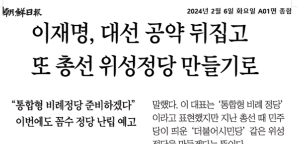특히 이른바 ‘보수’ 언론들이 맹공을 가하고 있다. 조선일보는 <이재명 대선 공약 뒤집고 또 총선 위성정당 만들기로>라는 제목으로 전하면서 “이번에도 꼼수 정당 난립을 예고한다”고 쓰고 있다. 중앙일보와 동아일보도 크게 다르지 않다. 중앙일보는 <거대 양당 4년 전 꼼수 위성정당 되풀이>로, 동아일보는 <또 48cm 투표지 위성정당 총선>이라는 제목으로 각각 이를 전하고 있다. 이들 주요 '보수' 신문들뿐만 아니라 다른 대부분의 언론들도 비슷한 시각이다.