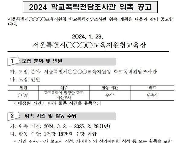 현재 전국의 교육장들은 조사관을 뽑고 있다. ‘모든 위험의 외주화’가 그렇듯 당연히 조사관도 정규직이 아니다. 그럼 비정규직일까? 그렇다고 보기도 어렵다. 사건 하나 당 18만 원(서울)을 주는 위촉 봉사직이기 때문이다. 비정규직보다도 못한 매우 위태로운 일자리 형태인 것이다.