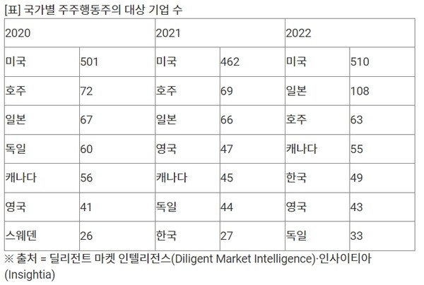 한국 기업의 아킬레스건은 대주주인 총수 일가의 이익을 위해 소액 주주가 피해를 보는 지배구조 탓이 크다. 지난해 행동주의 펀드와 소액주주연대 등 주주권 행사의 공격 대상이 된 한국 기업의 수가 전 세계에서 4번째로 많은 것도 이와 무관하지 않다. 영국의 기업거버넌스 리서치업체 딜리전트 마켓 인텔리전스에 따르면 작년 한 해 동안 한국에서는 73개 기업을 대상으로 총 91개의 주주행동주의 캠페인이 일어난 것으로 집계됐다고 연합뉴스가 12일 전했다. 미국과 일본, 캐나다에 이어 네 번째로 많았다. 행동주의 펀드 등의 공격을 받은 한국 기업은 2021년 27개, 2022년 49개로 꾸준히 늘고 있다.