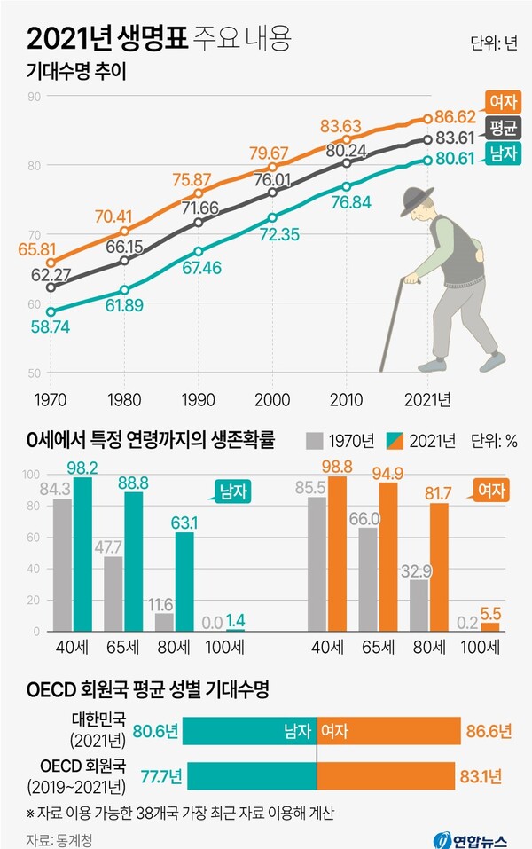 통계청 발표 2021년 생명표…남 80.6, 여 86.6
