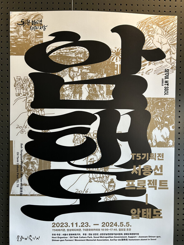 서울시 문화비축기지에서 열리고 있는 T5기획전 ‘서용선 프로젝트-암태도’(2023. 11. 23.~2024. 5.5.)에 주목한다. 전시는 전남 신안군 암태면(암태도) 단고리에 소재한 서용선미술관(옛 암태농협창고) 상설전 ‘암태소작쟁의-100년을 기억하다’ 자매전이다. 작가가 2022~2023년 1년 6개월에 걸쳐 암태도에서 진행한 현장작업의 결과물인데, 서용선미술관(암태도 소작쟁의 100주년 기념전시관에서 개명됨)에는 내벽에 조성된 대형 벽화를, 문화비축기지에는 움직일 수 있는 유화와 드로잉, 아카이브, 영상물을 선보인다.