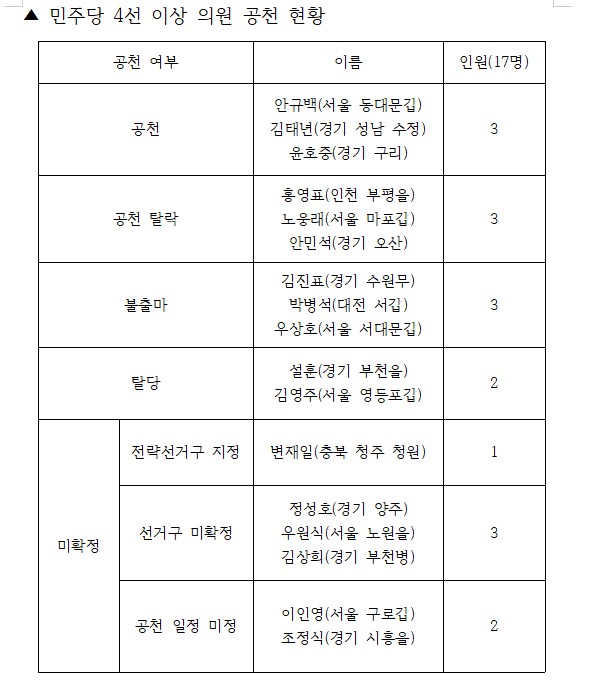 전체적으로 민주당 4선 이상 17명 가운데 3명(안규백, 김태년, 윤호중)의 공천이 확정됐으며 3명(박병석, 김진표, 우상호)은 이미 불출마를 선언했다. 3명(홍영표, 노웅래, 안민석)은 공천 탈락이 확정됐으며 1명(변재일)은 전략선거구의 경선 실시 여부가 관건이 될 것으로 보인다. 2명(설훈, 김영주)은 이미 탈당 의사를 밝혔으며 선거구 획정이 미뤄지고 있는 3명(정성호, 우원식, 김상희)을 제외한 나머지 2명(조정식, 이인영)은 아직 공천 방향이 결정되지 않았다.