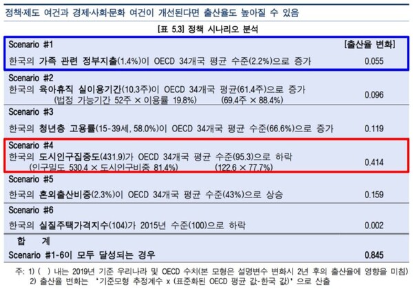 위 표에서 보는 바와 같이 가장 큰 변화를 만들어 내는 시나리오는 4번 시나리오 (빨강 박스) ‘도시인구집중도’를 OECD 평균으로 낮추는 것이었다. 내가 ‘공정귀촌’을 제안하는 이유 중의 하나도 바로 도시 인구 집중도를 줄여야 도시도 살고 촌도 살기 때문이다. 그런데 최근 정부의 정책들을 보면 시나리오 1번(파랑 박스)‘가족 관련 정부지출’을 늘리는 것에 집중되고 있는 것으로 보인다. 이 정책은 위 6개 시나리오 중 꼴찌에서 두 번째의 출산 효과를 보이는데 머물고 있다. 다른 시나리오에 비해 상대적으로 효과가 미미하다는 것이다.