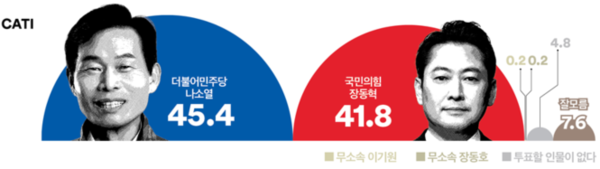 여론조사꽃이 3월 27~28일 충남 보령·서천 선거구 거주 만 18세 이상 남녀 502명을 대상으로 한 전화면접 조사(표본오차 95% 신뢰수준에 ±4.4%포인트, 응답률 23.9%, 자세한 내용은 중앙선거여론조사심의위원회 홈페이지 참조)에 따르면, ‘6전7기’에 나서는 민주당의 나소열 후보가 45.4%로 41.8%를 받은 국민의힘 현 사무총장인 장동혁 후보를 오차범위 내에서 3.6%포인트 처음으로 앞서는 결과가 나왔다. 적극투표층에선 나소열 46.2% 대 장동혁 45.3%(격차0.9%포인트)로 우열을 가릴 수 없을 만큼 팽팽했다.