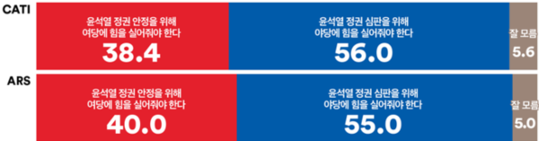 한편 여론조사꽃 정례여론조사에선 차기 총선을 통해 정권을 심판해야 한다는 목소리가 지난 조사와 비슷한 것으로 나타났다. 전화면접 조사에선 0.6%포인트 오른 반면, ARS 조사에선 1.5%포인트 내렸다. 세부적으로 보면, 여론조사꽃이 3월 29~30일 전국 만 18세 이상 남녀 1005명을 대상으로 한 전화면접 조사 결과, ‘윤석열 정권 심판을 위해 야당에 힘을 실어줘야 한다’는 0.6%포인트 오른 56.0%, ‘윤석열 정권 안정을 위해 여당에 힘을 실어줘야 한다’도 1.7%포인트 오른 38.4%로 조사됐다. 같은 기간 전국 만 18세 이상 남녀 1000명을 대상으로 한 ARS에서는 정권 심판이 1.5%포인트 내린 55.0%, 정권 안정은 0.2% 오른 40.0%였다.