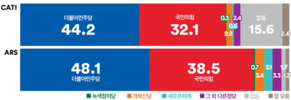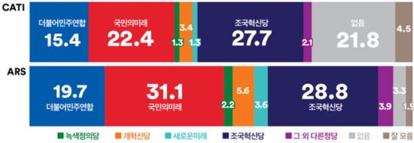 그러나 같은 기간에 진행한 ARS 조사 결과에선 국민의미래가 지난 조사 대비 0.4%포인트 내린 31.1%로 가장 높은 응답을 기록했으며, 조국혁신당이 지난 조사 대비 0.1%포인트 오른 28.8%로 그 뒤를 이었다. 더불어민주연합은 지난 조사보다 1.9%포인트 내린 19.7%였다. 이 밖에 △ 개혁신당 5.6%(1.5%포인트↑) △ 새로운미래 3.6%(0.6%포인트↓) △ 녹색정의당 ’ 2.2%(0.9%포인트↑) △그 외 다른정당 3.9%(0.2%포인트↑) △ 지지정당 없음 3.3%(0.6%포인트↑) 등으로 집계됐다.