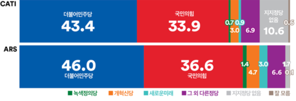 거대 양당의 정당 지지도 격차는 전화면접 조사에선 민주당 민주당 43.4%(1.6%포인트↑)와 국민의힘 33.9%(1.1%포인트↑)로 9.5%포인트였으며, ARS에선 민주당 46.0%(1.0%포인트↓)와 국민의힘 36.6%(0.1%포인트↑)로 9.4%포인트로 조사됐다.