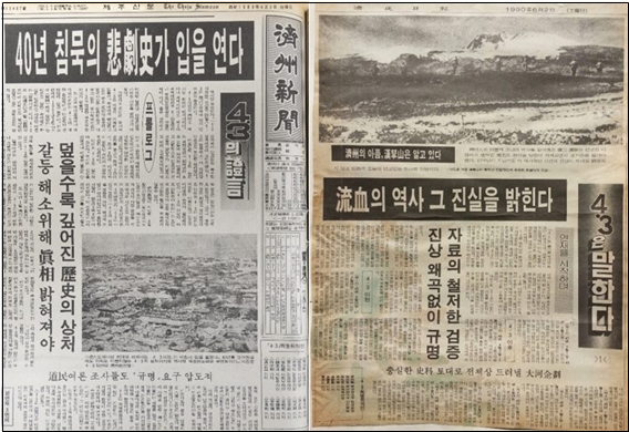 “당시 언론의 연재물 제목들은 전부 명사의 결합으로 돼 있었는데, 편집국장님이 ‘4.3’이 주어가 되어 ‘말한다’는 제목을 달았어요. 우리도 진실을 모르지 않냐? 우리가 밝혀내는 실체적 진실이 말하게 하자는 거였죠.”
