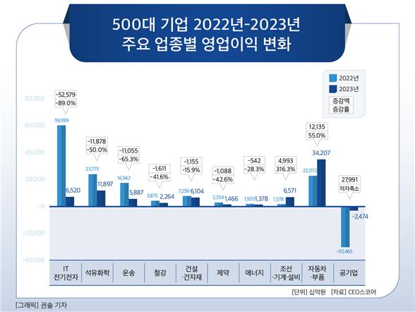 업종별로는 전체 18개 업종 중 13개 업종에서 영업이익이 감소했다. 가장 많이 줄어든 업종은 지난해 글로벌 경기 둔화로 극심한 수출 부진을 겪었던 IT전기전자 분야다. 지난해 영업이익은 6조5203억 원으로, 2022년 59조986억 원보다 89.0% 급감했다. 석유화학은 23조7755억 원에서 11조8970억 원으로 반토막 났고 운송업도 영업이익이 65.3% 줄어 5조8873억 원에 그쳤다. 철강과 제약은 40%대 감소율을 기록했고 건설·건자재도 16% 이익이 줄었다.