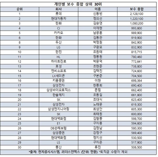 퇴직금을 제외한 개인 최고 보수 수령자는 신동빈 롯데그룹 회장이다. 그는 총 212억 8100만 원을 받았다. 정의선 현대차그룹 회장은 122억 100만 원, 김승연 한화그룹 회장은 108억 200만 원, 이재현 CJ그룹 회장은 99억 3600만 원, 김승연 회장의 장남인 김동관 부회장은 91억 9900만 원, 박정원 두산 회장은 84억 2900만 원, 구광모 LG 회장 83억 2900만 원, 조원태 한진 회장은 81억 5715억 원을 받은 것으로 집계됐다.