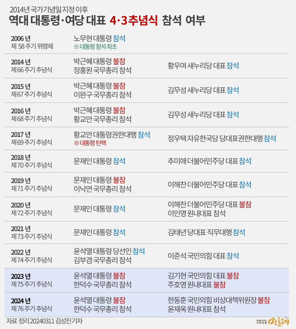 <시민언론 민들레>가 제주 4·3 추념식이 국가 기념일로 공식 지정된 2014년 66주기 추념식부터 2024년 76주기 기념식까지 참석자를 조사한 결과, 박근혜 당시 대통령은 2014~2016년 4·3 국가기념일 지정에도 3년 연속 불참했지만, 대통령을 대신해 국무총리(정홍원, 이완구)와 여당인 새누리당 대표(황우여, 김무성)가 참석했다. 박근혜 탄핵과 19대 대선이 있었던 2017년에도 황교안 대통령 권한대행과 자유한국당 정우택 당대표 권한대행이 추념식에 자리했다(아래 그래픽 참고).