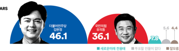 평택병 김현정 46.1%, 유의동 36.1%, 전용태 7.8%