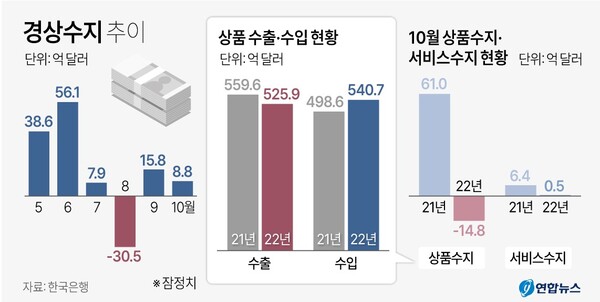 한 달 뒤 5월 곧바로 흑자 기조를 회복했지만, 넉 달 만인 8월 다시 30억5000만 달러 적자로 돌아섰고 9월(15억8000만 달러)에 이어 10월(8억8000만 달러) 두 달 연속 흑자를 냈지만 적자를 겨우 피한 수준이다.
