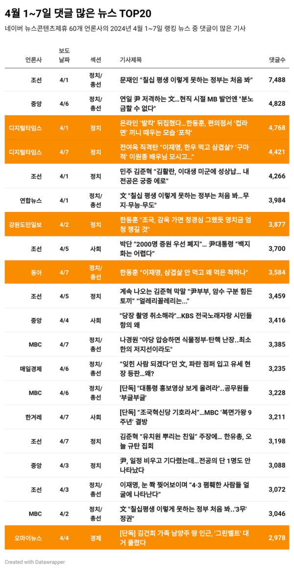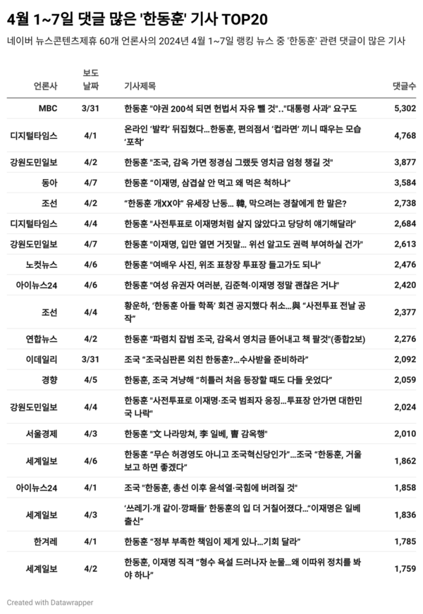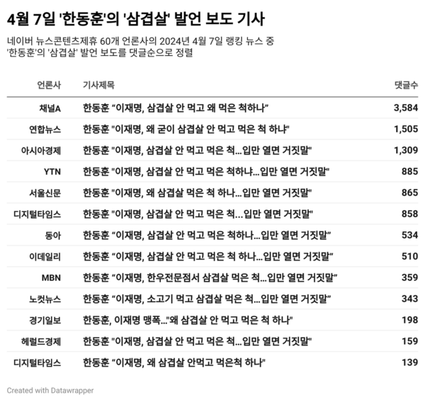 표에서 보듯 언론은 굳이 다루지 않아도 되는 유세 현장의 자극적인 말을 기사 제목으로 ‘뽑았다’. 7일부터 흥하기 시작한 한동훈 위원장의 ‘삼겹살’ 관련 보도는 4월 7일 하루만 해도 36건이 랭킹뉴스에 올랐고 댓글 많은 뉴스 TOP20에 5건이나 있었다.