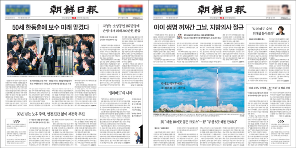 그래서일까. 작년 12월 22일 “50세 한동훈에 보수의 미래 맡겼다”며 1면에 대서특필했던 조선일보는 투표 전날인 4월 9일 보수의 미래 따윈 싣지 않았다. “北 지켜볼 눈이 생겼다”며 파란색 배경의 우리 군 정찰위성 2호기 발사 성공을 알렸다. 왜 하필 파란색에 숫자 1로 보이는 사진을 1면 톱에 실었는지 의아하다. 방송통신심의위원회가 MBC 날씨 보도 자막 ‘1’에 대해 야단법석을 떠는 바람에 이 사진마저 기호 1로 보인다. 혹시 조선일보가 회심한 건 아닐까.