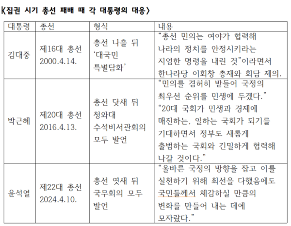 문민정권인 김영삼 정권 이후 집권 기간에 실시된 총선에서 여당이 제1당이 되지 못한 선거는 세 번뿐입니다. 김대중 정권 시절의 제16대 총선, 박근혜 정권의 제20대 총선, 그리고 윤석열 정권의 제22대 총선입니다. 윤 대통령은 이들 세 번의 총선에서 가장 늦게 대국민 메시지를 냈습니다. 김 전 대통령이 총선 나흘만으로 가장 빨랐고, 박 전 대통령이 닷새, 윤 대통령이 엿새 만입니다.