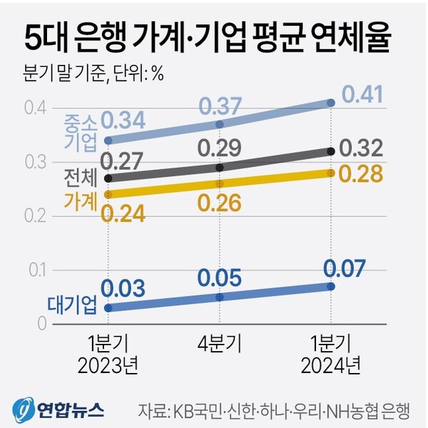 기업 사정이 어려워지면서 고금리로 이자 장사를 하며 높은 수익을 올렸던 시중은행들마저 휘청거리고 있다. 아직 우려할 수준은 아니지만 부실 채권이 늘면서 자산 건전성에 경고등이 켜진 것이다. 금융권에 따르면 5대 은행(KB국민·신한·하나·우리·NH농협)의 올해 1분기 말 기준 단순 평균 대출 연체율은 0.32%로 집계됐다. 전년 동기와 전 분기 대비 모두 높아졌다. 특히 기업 대출 연체율은 지난해 1분기 말 0.30%에서 올해 1분기 말 0.35%로 올랐다. 중소기업이 0.34%에서 0.41%로 상승 폭이 컸다.