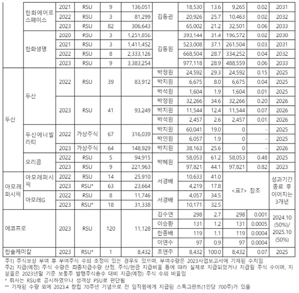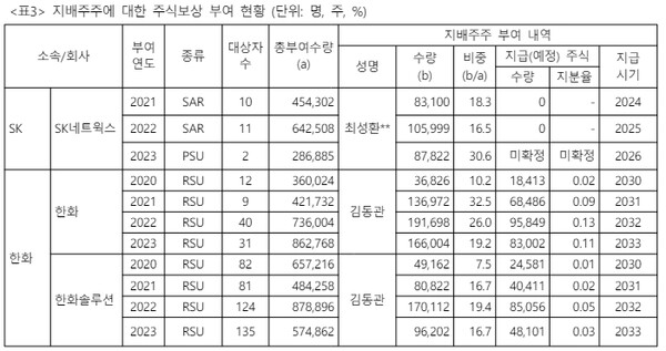 44개 기업에서 ‘대주주 등과의 거래내용’에서 개인별 주식기준보상 현황을 공시한 임원은 총 171명(중복포함)이다. 이들 가운데 SK와 한화, 두산, 아모레퍼시픽, 에코프로, 한솔 등 6개 그룹 12개 사에서는 총수 일가 등 지배주주 임원 18명(중복제외 14명)에게 주식기준보상을 부여한 것으로 나타났다.
