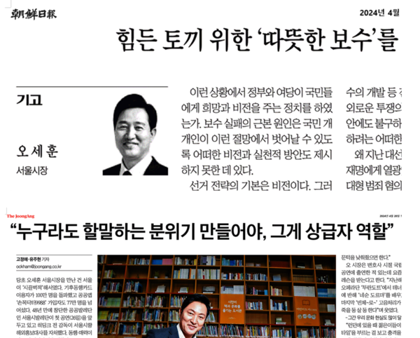총선 참패로 여당의 리더십 공백이 생긴 가운데 오세훈 서울시장에게 주목하는 언론들이 많다. 특히 보수 언론들이 오 시장에게 힘을 실어주는 모습이다. 중앙일보의 20일 인터뷰는 “오 시장의 역할을 기대하는 시선이 늘었다”면서 그를 차기 대선 주자로 '등록'하는 듯하다. 조선일보는 아예 오 시장에게 지면을 내줘서 새로운 기치를 내걸도록 했다. 29일에 실린 <힘든 토끼 위한 ‘따뜻한 보수’를>이라는 오 시장의 기고문은 “정부 여당의 국정 기조가 따뜻한 보수로 바꿔야 산다”면서 “보수 실패의 근본 원인은 어떠한 비전과 실천적 방안도 제시하지 못한 데 있다”고 말한다.
