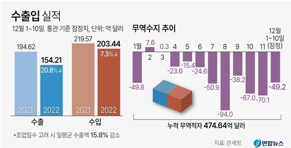 월간 수출은 지난 10월에 작년보다 5.7% 줄어 2020년 10월 이후 2년 만에 감소로 돌아섰다. 11월에는 14.0%나 줄면서 감소 폭이 커진 데 이어 이달 초순에도 '마이너스' 행진을 계속하는 모습이다.