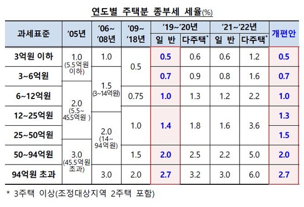 주택분 종부세율이 정부와 여당의 제안(0.5~2.7%)대로 조정된다면 종부세율은 현행 세율의 절반 이하로 떨어진다. 또한 종부세가 처음 도입된 2005년의 1.0~3.0%보다도 후퇴하는 셈이다.