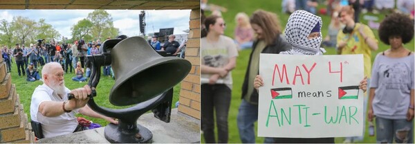 특히 이스라엘의 가자 살육전쟁을 규탄하는 반전·평화 운동이 대학가를 휩쓸고 있는 올해의 추모식은 더욱 각별할 수밖에 없다. 당시 피격으로 허리 아래가 마비되는 중상을 입은 D. 칼러는 ‘승리의 종(Victory Bell)’—1970년 5·4 시위의 시작을 알린 종—을 울렸고(왼쪽 사진), 학생들은 5·4의 비극을 되새기며 팔레스타인 연대 시위와 농성 집회를 열었다.(오른쪽 사진). 칼러는 “역사를 잊는 자, 역사를 반복한다”면서 “그때나 지금이나, 정의와 불의의 문제, 권력 남용의 문제가 여전히 우리 사회를 옭아매고 있다”고 안타까워했다. 팔레스타인 연대운동에 참여하고 있는 한 학생은 “우리가 벌이는 반전·평화 운동이 올바른 역사를 만들어 낼 것”이라는 희망을 피력했다.
