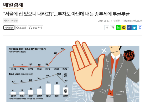 특히 경제지들과 건설회사 소유의 언론들은 지난달 헌재의 종부세 합헌 결정에 대해 억지 논리를 들이대며 종부세 폐지 주장을 폈다. 매일경제는 30일 “종부세 합헌 결정 나왔지만 재산세와 합치는 게 옳다” 제목의 사설에서 “중산층 부담을 줄여주고 이중과세, 징벌적 과세 논란을 해소할 수 있도록...종부세를 폐지하고 재산세로 일원화하는 것이 옳다”는 주장을 폈다. 이 신문은 “집 한 채가 전재산인데...강남 아닌 강북주민이 서울 종부세 40% 낸다”(6.2), “서울에 집 있으니 내라고?...부자도 아닌데 내는 종부세에 부글부글”(5.31) 등의 기사에서 ‘중산층 세금폭탄’이란 논리로 종부세 흔들기에 나섰다.