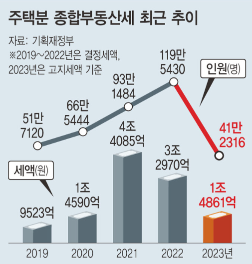 종부세 납부자 수와 세액은 문재인 정부 때에 크게 늘었다. 집값이 급격히 상승한 것이 가장 큰 이유다. 그러나 윤석열 정부 들어 과세대상과 납세금액이 대폭 줄었다. 윤 정부가 주택 공시가격 현실화율과 세율을 낮추고 기본공제는 인상하는 감세조치를 추진했기 때문이다. ‘덕분에’ 지난해 종부세 납세자 인원은 전년 120만 명에서 3분의 1로 줄고 3조 가량의 세액도 1조5천억으로 반토막 났다. 이미 이 정부가 부자감세로 그야말로 ‘최상위층 집 부자’가 아니면 웬만한 부자도 종부세 과세 대상에 포함되지 않도록 해놓은 것이다. 그런데도 언론은 아직도 ‘종부세는 중산층 세금’이라는 황당한 주장을 하고 있다.