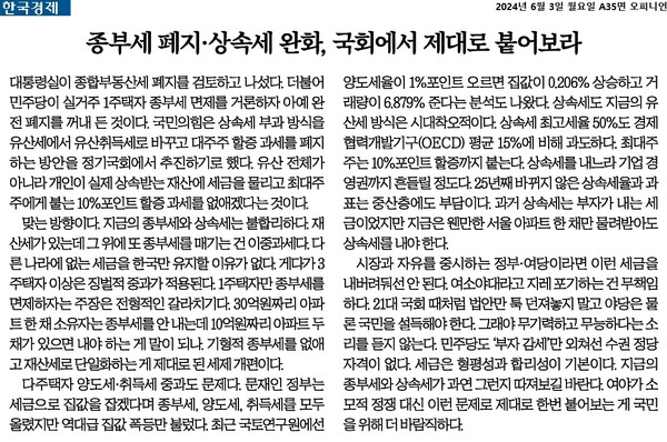 서울경제도 같은 날 사설에서 “헌재는 종부세 적법성 여부를 판단한 것이지 경제현실과 국제기준에 맞는 것인지를 따지는 것은 아니다”라며 “헌재 결정과 무관하게 종부세를 폐지하거나 완화해야 한다”고 주장했다. 한국경제는 “종부세 폐지·상속세 완화, 국회에서 제대로 붙어보라” 제목의 사설에서 “(종부세 폐지는) 맞는 말”이라고 단정하고 역시 ‘이중과세’ ‘징벌적 중과’라는 이유로 종부세가 ‘불합리하고 기형적’이라고 주장했다.