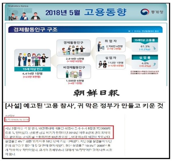 경제 이슈 중 고용 이슈는 상징성이 가장 컸다. ‘일자리 대통령’을 표방한 문 대통령이 청와대 여민관 집무실에 ‘일자리 상황판’ 설치를 ‘1호 공약’으로 내세우며 첫 번째 사인해서 구성한 것이 일자리 위원회였고, 대통령이 직접 위원장을 맡을 정도로 ‘고용’은 문재인 정권의 핵심 사안이었다. 그리고 2018년 5월 고용 지표는 문재인 정권의 일자리 1년 성과를 보여주는 상징성을 가졌다. 2018년 5월 고용 지표에 대해 조선일보는 ‘사설’까지 동원하며 대대적 공격을 가하였다. 2018년 2월부터 4월까지 3개월 간 연속 10만 명대의 취업자 증가 수가 5월에 7만 2천 명 증가로 10만 명대가 붕괴된 것을 기회로 삼은 것이다.