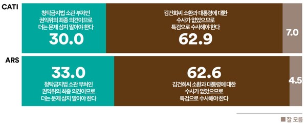‘여론조사꽃’이 6월 14일·15일 이틀 간 전국 만 18세 이상 남녀 1001명(전화면접 방식)과 1003명(ARS 방식)을 대상으로 진행한 여론조사(표본오차 ±3.1%포인트, 95% 신뢰수준, 자세한 사항은 중앙선거관리위원회 홈페이지 참조) 결과, 명품백 수수는 ‘청탁금지법 소관 부처인 권익위의 최종 의견이므로 더는 문제 삼지 말아야한다’ 30.0% 대 ‘김건희씨 소환과 대통령에 대한 수사가 없었으므로 특검으로 수사해야 한다’ 62.9%(이상 전화면접), ARS조사 결과 ‘더는 문제 삼지 말아야한다’ 33.0% 대 ‘특검으로 수사해야 한다’ 62.6%로 조사되어 10명 중 6명 이상은 ‘김건희씨 소환과 대통령에 대한 수사가 없었으므로 특검으로 수사해야 한다’고 생각하는 것으로 나타났다.