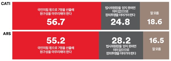 더불어민주당이 법사위 등 11개 상임위 위원장을 선출하고 단독으로 운영하고 있는 국회 상황에 대한 조사에서는 ‘국민의힘 몫으로 7명을 선출해 원 구성을 마무리해야 한다’ 56.7% 대 ‘법사위원장을 얻지 못하면 의미 없으므로 장외투쟁을 이어가야 한다’ 24.8%(전화면접), ‘원 구성을 마무리해야 한다’ 55.2% 대 ‘장외투쟁을 이어가야 한다’ 28.2%(ARS조사)로 응답해 두 조사의 응답자 10명 중 과반 이상은 ‘국회 원 구성을 마무리해야 한다’고 생각하고 있으며 국민의힘 장외투쟁에 대한 지지는 상대적으로 낮은 것으로 나타났다. 이 조사에서는 더불어민주당・국민의힘・조국혁신당 지지층과 진보・중도・보수층 가릴 것 없이 모두 한목소리로 ‘원 구성을 마무리해야 한다’는 응답이 높았다. ARS조사의 국민의힘 지지층만이 ‘원 구성을 마무리해야 한다’ 43.4% 대 ‘장외투쟁을 이어가야 한다’ 46.4%로 조사되어 양 응답이 3.0%p의 격차로 팽팽했다.