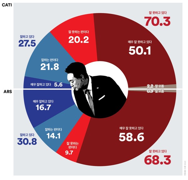 - 국정지지율 ‘긍정’ 27.5%, ‘여론조사꽃’ ARS 최저치