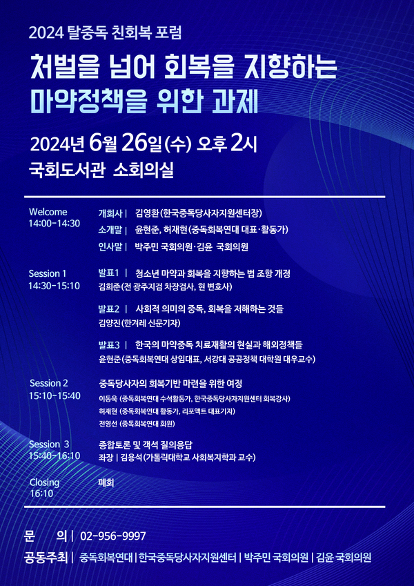 ※ 이 글은 6월 26일 국회에서 열리는 '탈중독 친회복 포럼'을 알리기 위해 쓴 글입니다. 중독으로 고통받는 분들, 그리고 중독 문제를 고민해온 연구가, 시민사회가 함께해 주기 바랍니다. 시민언론 뉴탐사에서 포럼을 생중계해주기로 했습니다. 진심으로 감사합니다.