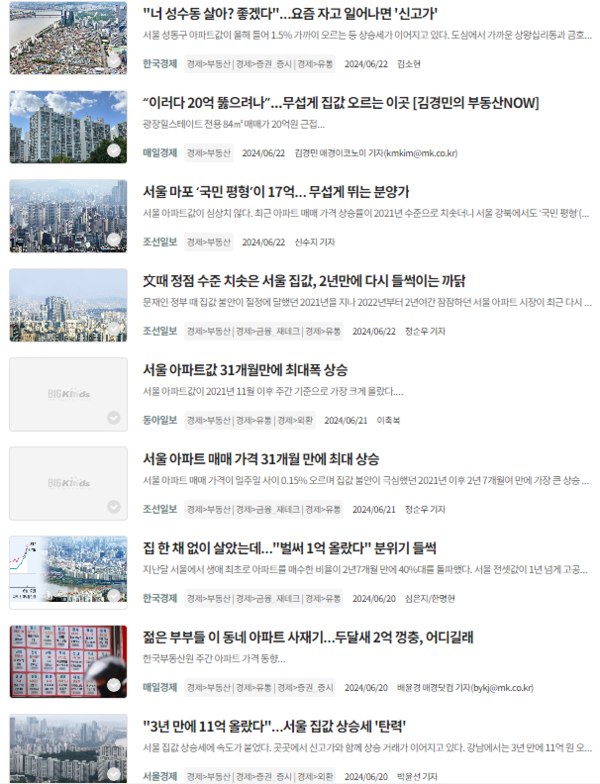 혹시 또 영끌? 부동산에 젊은 부부 북적인다...서울 아파트 거래 3년만에 최다(매경, 6.16)/ 2030 영끌족에 희망이? 꽁꽁 얼었던 노도강 풀리나(매경, 6.17)/ 빚내 집샀던 2030 영끌족 희망 보인다...꿈쩍 않던 노도강도 꿈틀(헤럴드경제, 6.17)/ 우와, 신고가 나오더니..서울 아파트 ‘상승전망’ 나왔다(머니투데이, 6.17)/ 똘똘한 한 채 사두자...‘마용성’에 서울 거주자 몰렸다(한국경제, 6.18)/ 비싸도 눈 딱 감고 지르자..서울 아파트 평균 11.5억에 거래, 1억 껑충(매경, 6.19)/ 전문가 절반 내년에도 집값 상승..연내 내집 마련하는 게 유리(한경, 6.19)/ 3년만에 11억 올랐다..서울 집값 상승세 ‘탄력’(서울경제, 6.20)/ 젊은 부부들 이 동네 아파트 사재기...두달새 2억 껑충, 어디길래(매경, 6.20)/ 집 한 채 없이 살았는데, “벌써 1억 올랐다” 분위기 들썩(한국경제, 6.20)/ 이렇다 20억 뚫으려나...무섭게 집값 오르는 이곳(매경, 6.22)/ 너 성수동 살아? 좋겠다...요즘 자고 일어나면 신고가(한경, 6.22)