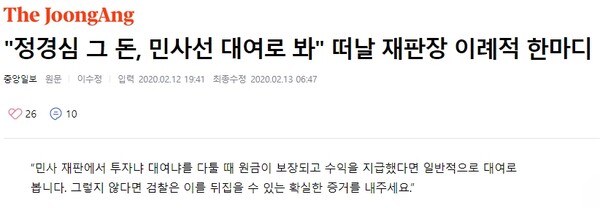 실제 정 교수의 1심 재판을 처음 맡았던 송인권 부장판사는, 재판부 교체를 당하기 전 공판에서 검찰을 향해 “민사 재판에서는 투자나 대여냐를 다툴 때 원금이 보장되고 일정 수익이 지급되면 대여로 보는 게 일반적이다. 그렇지 않다면 이를 뒤집을 확실한 증거를 내달라”라고 주문했다.