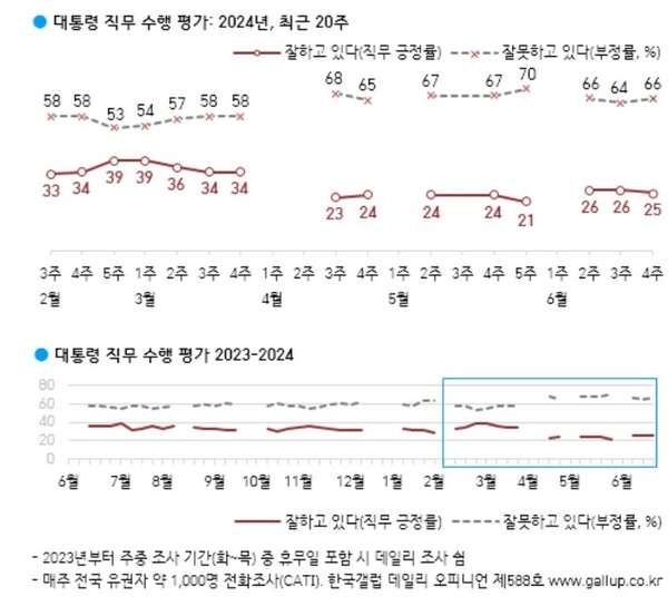 윤석열 대통령 국정 수행 지지도가 20% 중·후반대에서 움직임이 거의 없다. 한국갤럽이 28일 발표한 6월 4주차(25~27일, 전국 만 18세 이상 1002명 대상, 전화면접 조사방식, 표본오차 ±3.1%포인트, 95% 신뢰수준, 자세한 사항은 중앙선거관리위원회 홈페이지 참조) 대통령 직무 수행 평가에서 전 주보다 1%p 떨어진 25%가 긍정 평가했고 66%는 부정 평가했으며 그 외는 의견을 유보했다(어느 쪽도 아님 4%, 모름/응답거절 6%).
