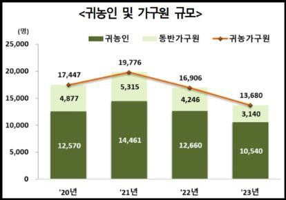 얼핏 생각하면 높은 주거비와 치열한 경쟁에 치여 사는 도시의 삶에서 탈출해 촌에서의 삶을 선택하는 귀촌이 많이 늘어날 것 같기도 한데 현실은 그렇지 않다. 지난 6월 25일 발표된 ‘2023년 귀농어·귀촌인 통계’에 따르면 귀농·귀촌인구는 전년보다 각각 4.5%, 5.5% 줄었다. 정부의 1년 전 ‘2022년 귀농어·귀촌인 통계’ 발표 때는 귀농·귀촌인구가 각각 12.3%, 15.0% 줄었으니 2023년은 그나마 감소 추세가 완화된 편이다.