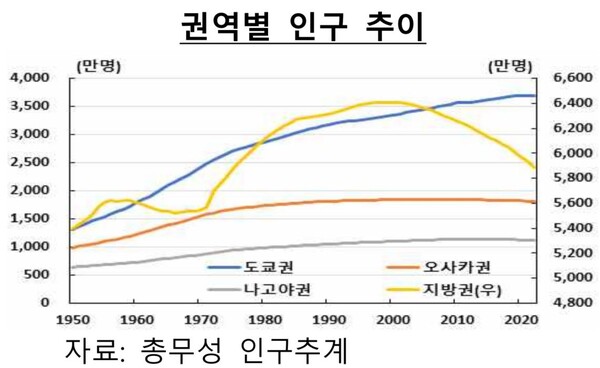 위 표에서 보는 것처럼 도쿄권은 꾸준히 인구가 늘고 있고, 오사카권과 나고야권은 정체 상태, 지방권은 2000년대 들어 크게 감소하고 있다. 해당 자료는 도쿄권 인구 집중의 특징으로 ‘진학 및 취업을 위한 15~29세 젊은 층의 도쿄권 이동’, ‘남성보다 높은 여성의 유입 비중’을 들며 ‘일본 정부의 지방 활성화 및 도쿄 집중 시정 노력에도 불구하고 고도화 산업 및 양질의 일자리 집적 등으로 당분간 가시적인 효과를 거두기 어려울 전망’이라고 비관적인 전망을 했다.