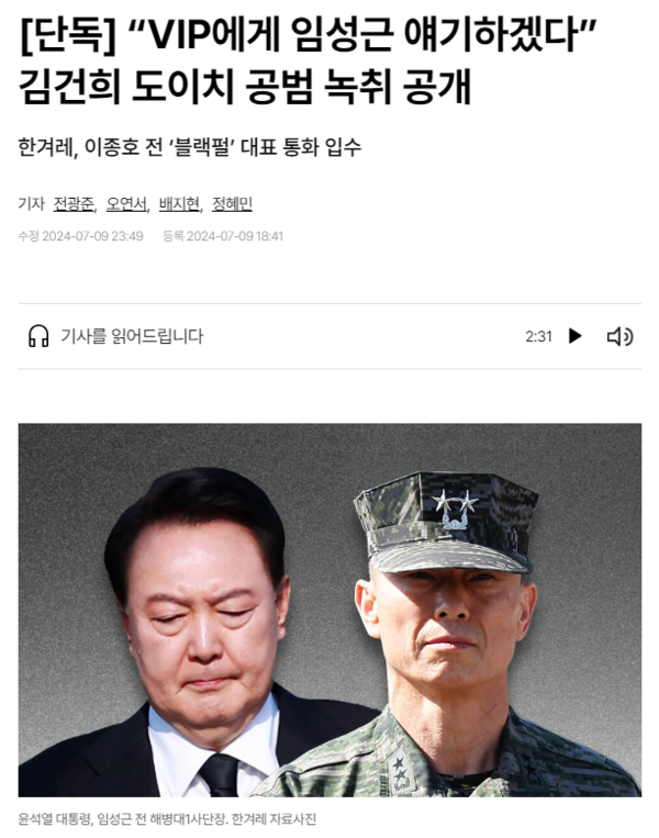 채 상병 사망 수사 무마 의혹과 관련해 도이치모터스 주가조작 공범이 ‘VIP’를 상대로 임성근 사단장 구명 로비를 벌인 통화 녹취록이 언론에 공개돼 파문이 일고 있다. 주가조작 범죄에 함께 연루되어 김건희 씨와 ‘특수관계’에 있는 이종호 전 블랙펄인베스트 대표가 김건희 씨와 윤석열 대통령을 상대로 임성근 사단장 구명 로비를 벌였다는 것이다.