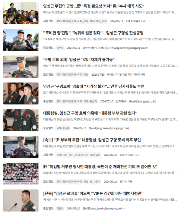 이들은 오히려 녹취록 ‘특종’ 보도에 대해 이를 부인하고 해명하는 이종호 대표와 대통령실 입장을 꼼꼼히 보도하는 기이한 행태를 보였다. 중앙일보 “[단독] ‘임성근 로비설’ 이모 씨 ‘VIP는 김건희 아닌 해병사령관’”, 조선일보 “‘구명 로비 의혹’ 임성근 ‘로비 자체가 불가능’” 서울신문 “[속보] ‘윤 부부와 무관’ 대통령실, 임성근 구명 로비 의혹 부인” 등의 기사다.