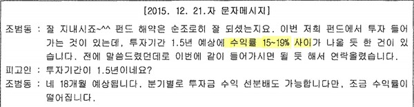 한편, 재판부는 이 논거 외에 별도의 논거로서 조범동이 12월 21일 보냈던 위 메시지에서 추가로 “분기별로 투자금 수익 선분배도 가능”이라고 써놓은 것을 가리켜, “위험을 낮추기 위해 수익률 감소를 감수하고 분기별로 수익을 나눠 받는 투자계약”이라고 규정했다.