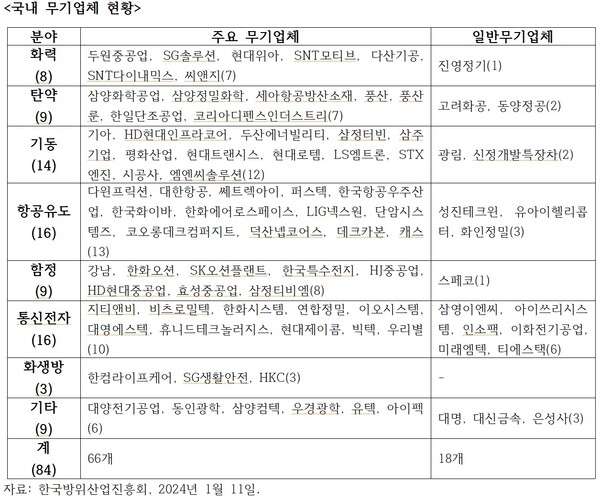 2023년 3분기 말 기준 방산 5사(한화에어로스페이스, 한국항공우주, 현대로템, LIG넥스원, 한화시스템) 수주 잔고는 약 104조 원 규모로 전년 말 대비 약 1.3% 성장했다. 자본시장 역시 무기 수출 기업들의 성장세를 반영해, 한국의 록히드마틴을 꿈꾼다는 무기회사 여럿을 둔 대기업 계열의 한 자산운용사에서는 국내 무기 분야 10대 기업을 대상으로 한 투자상품까지 만들어 판매하고 있다. 국민연금 역시 2023년 상반기 한화시스템, 풍산과 같은 대표적 무기기업에 대한 투자를 늘렸다.(서울경제, “국민연금, 리오프닝 덜고 방산‧반도체에 베팅했다,” 2023년 7월 5일)