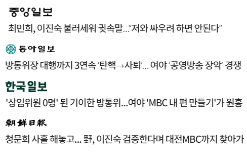 “방송장악 위해 방통위 부위원장까지 탄핵 나선 거야(巨野) 횡포”(세계일보)라며 마치 문제가 야당에게 있는 것처럼 황당한 주장을 하는 언론도 있다. 윤석열 정권 출범 이후 이동관·김홍일 방통위원장과 이상인 위원장직무대행까지 야당의 탄핵소추 대상이 되고 사퇴하게 된 이 사태의 가장 큰 책임은 누구에게 있는가? ‘방송장악’은 누가 하고 있는가? 공영방송 KBS를 ‘땡윤뉴스’ 매체로 전락시키고 정부비판 보도에 마구잡이 ‘심의-제재’ 폭탄을 투하하는 것은 여당인가 야당인가? 이진숙 내정자는 청문회에서 “MBC가 정상화하도록 이사진을 교체하겠다”고 밝혔다. MBC마저 '땡윤' KBS처럼 어용방송을 만들어 방송을 장악하려는 쪽은 야당인가 여당인가?