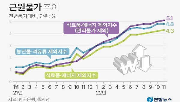 관리물가 제외 근원물가 상승률 9월 4.8% →11월 5.1%