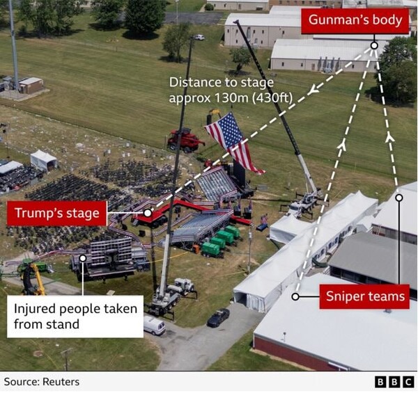 지난 7월 13일, 대통령(후보) 암살미수 사건이 터졌다. 저녁 6시 조금 지나 연설이 시작되고 약 8분여, 총성이 울리고 총알은 트럼프의 귀를 스쳤다. 사건 현장 사진을 보면 암살범과 트럼프의 거리는 대략 130여 미터. 암살범을 사격한 경호실 저격팀(사진 아래쪽 건물 지붕에 sniper teams라고 표기된 위치)과의 거리 역시 그와 비슷하다.
