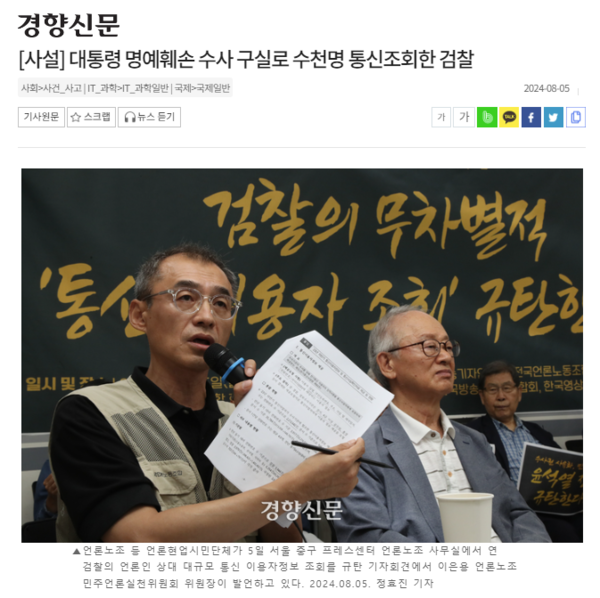 주류 언론의 대부분을 차지하는 조선일보와 그 아류 매체들, 친윤·관제 방송으로 전락한 방송들이 윤석열 정부가 어려움에 빠졌을 때 후원하는 방식은 대체로 3가지다. 첫째, 축소 보도하기, 둘째, 양비론 또는 여야 정쟁으로 몰기, 셋째, 아예 보도하지 않기다. 이번 통신조회 사태의 경우 축소 보도 또는 아예 보도하지 않는 방식(조선일보, 서울신문, KBS 등)으로 사회적 의제에서 제외하고 국민들의 눈과 귀를 차단하고 있다.
