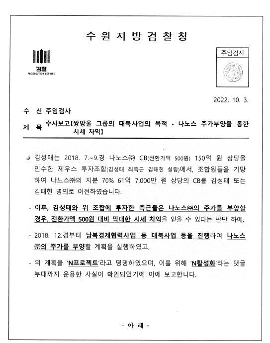 <리포액트>가 입수한 검찰의 대외비 수사보고서를 보면, 수원지검은 2022년 10월 3일 '수사보고 : 쌍방울그룹의 대북사업의 목적 - 나노스 주가 부양을 통한 시세차익'이라는 제목의 보고 문건을 만들었다.