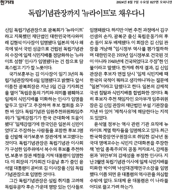 대부분의 주류 언론들도 이 사태를 중요하게 보도했다. 경향신문의 사설 제목처럼 ‘제 정신을 갖고 있는’ 언론이라면 친일 뉴라이트 성향의 인사를, 다른 곳도 아닌 독립기념관장에 임명한 이 정부의 반역사적·반민족적 행태를 강력히 비판하는 게 당연하다. 이것은 무슨 정치적·정파적 진영 간의 대립이 아니라 우리 민족의 역사와 정체성, 국민 보편적 감정은 물론이고 헌법 가치를 농락하는 일이기 때문이다.